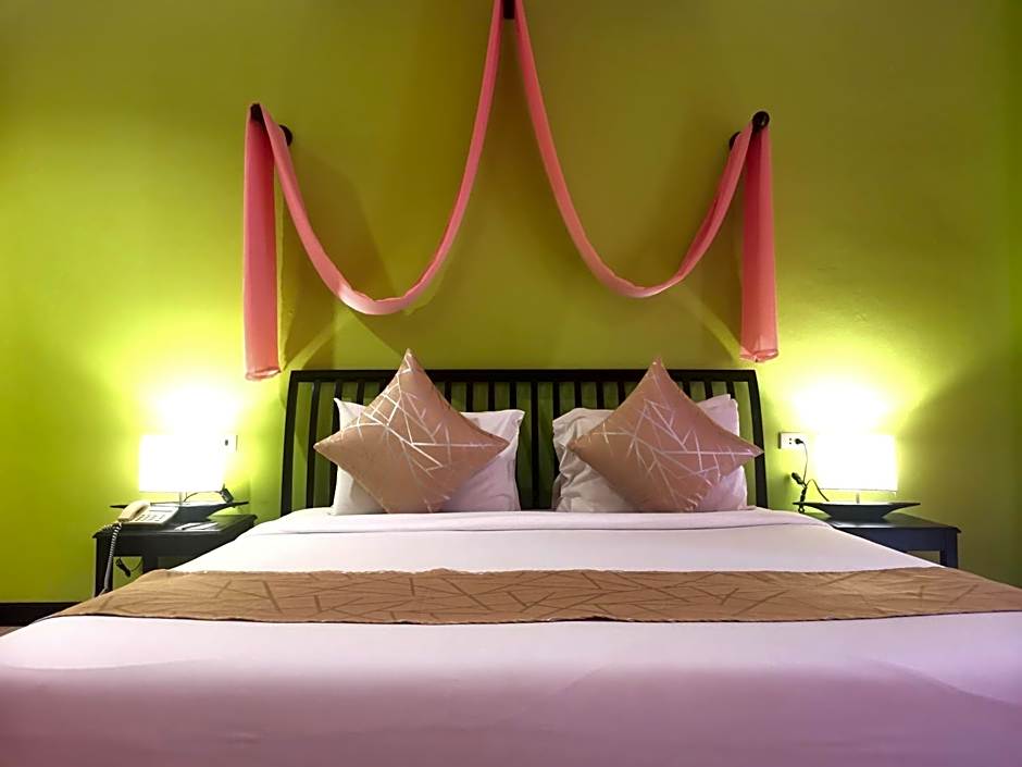 Deluxe Villa is 484 square feet and includes a queen-size bed 150-154 width plus safe, bathrobes, and slippers.